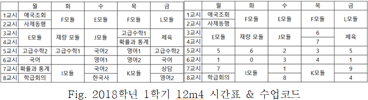 연구에서는 11학년과 12학년만 고려하여 알고리즘을 짰다. 일단 개체는 11학년과 12학년을 대상으로 한 하나의 시간표로 설정하였고, 다른 요소들은 추후에 코딩을 통해 고려하기로 하였다. 이후 계열별로 모든 수업의 수업코드를 설정하여, 하나의 염색체는 각 학급의 시간표로 만들었다.