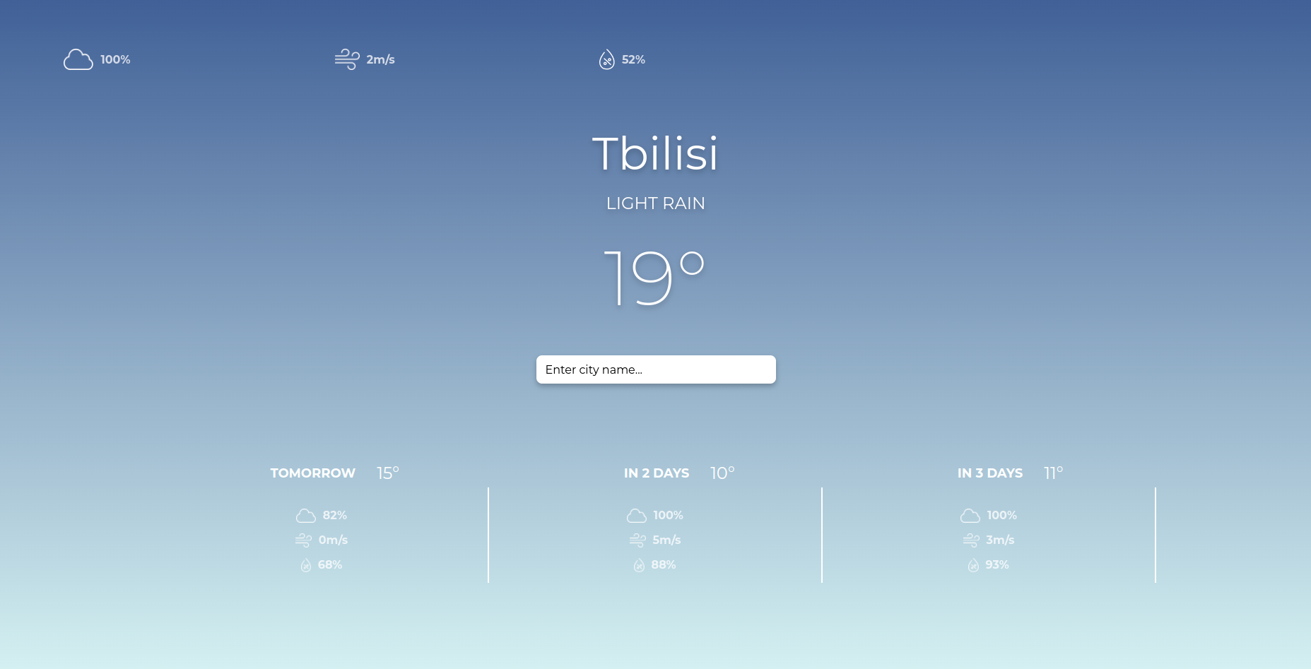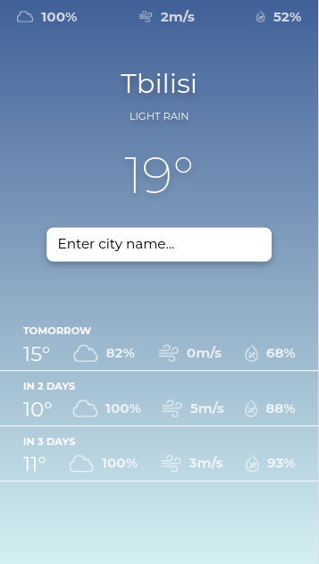 I developed the app to practice HTML and CSS with JavaScript. It was also my first contact with an API communication (OpenWeather). The app allows checking the weather forecast in most cities worldwide three days ahead. There are also implemented functions like API calls based on geolocation and localStorage (if there's any data saved and the Geolocation API is blocked). Design implemented with Mobile First approach.