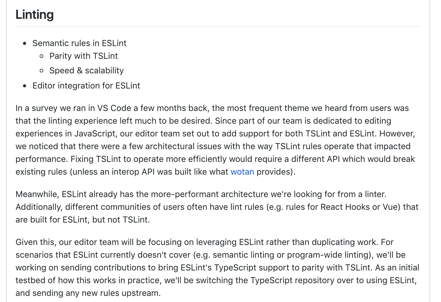 @nodkz Not really, first time I'm reading this post about the Typescript team going for ESLint instead of TSLint ! From this post of the ESLint team (https://eslint.org/blog/2019/01/future-typescript-eslint), this repo seems to centralize all the packages needed to enable a full Typescript support in ESLint : https://github.com/typescript-eslint/typescript-eslint