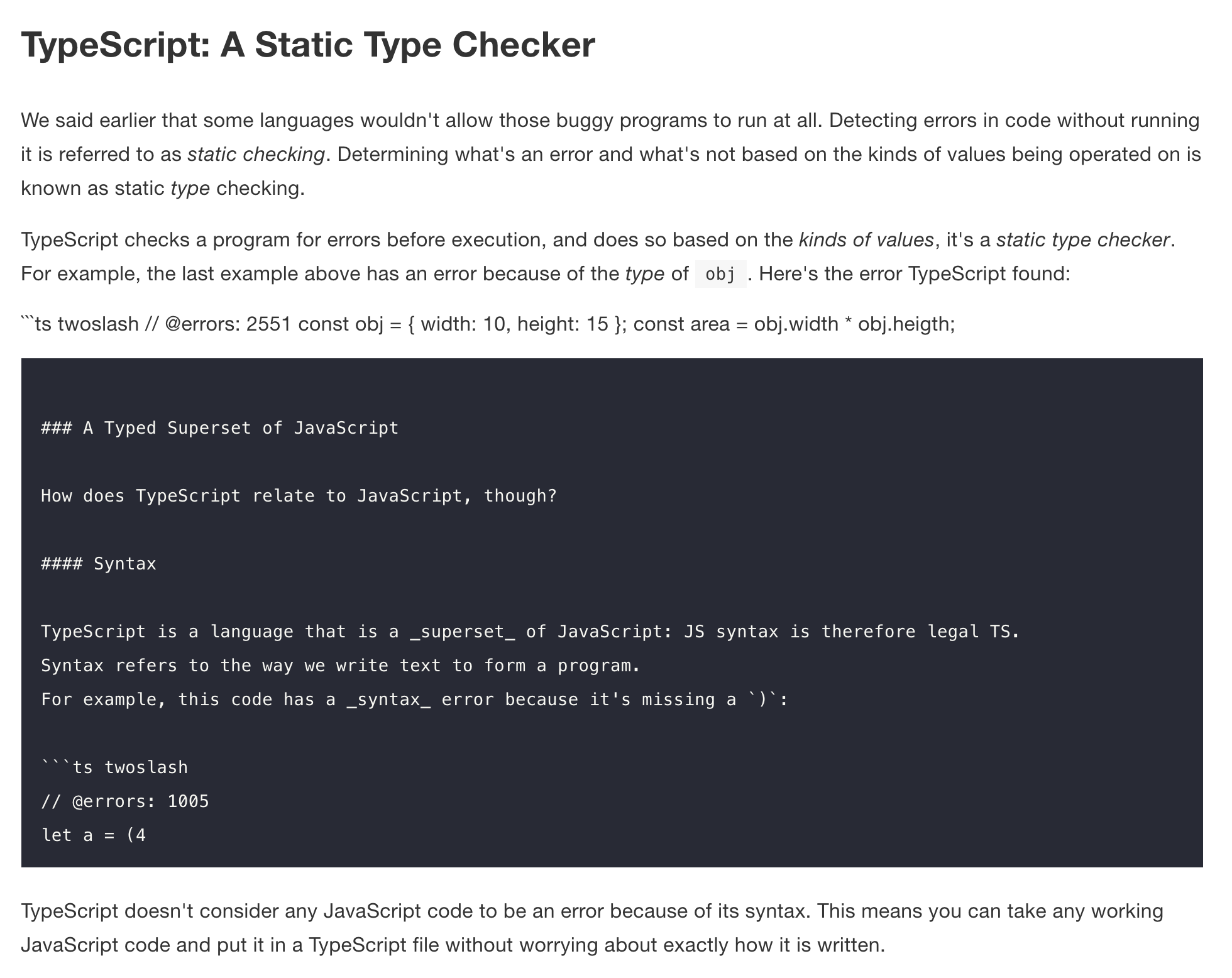 * 내용: [Typescript Handbook](https://typescript-kr.github.io/pages/tutorials/ts-for-the-new-programmer.html) 한글버전에 올라와있는 문제입니다. 업로드한 이미지에서 다음의 내용을 가지고 있는 code block이 마크다운이 정상적이나, 렌더링에서 꼬인 모습을 보이고 있습니다. ``` ts twoslash // @errors: 2551 const obj = { width: 10, height: 15 }; const area = obj.width * obj.heigth; ``` 해당 내용 예전에 제가 블로그 마크다운할 때, 여러 번 있었던 문제였는데 어떻게 해결할 지 모르겠네요. 해결해주실 수 있나요? <img width="980" alt="스크린샷 2020-08-10 오후 10 15 09" src="https://user-images.githubusercontent.com/59246456/89787092-e347e980-db57-11ea-9ddd-291cd1f9a4f5.png">