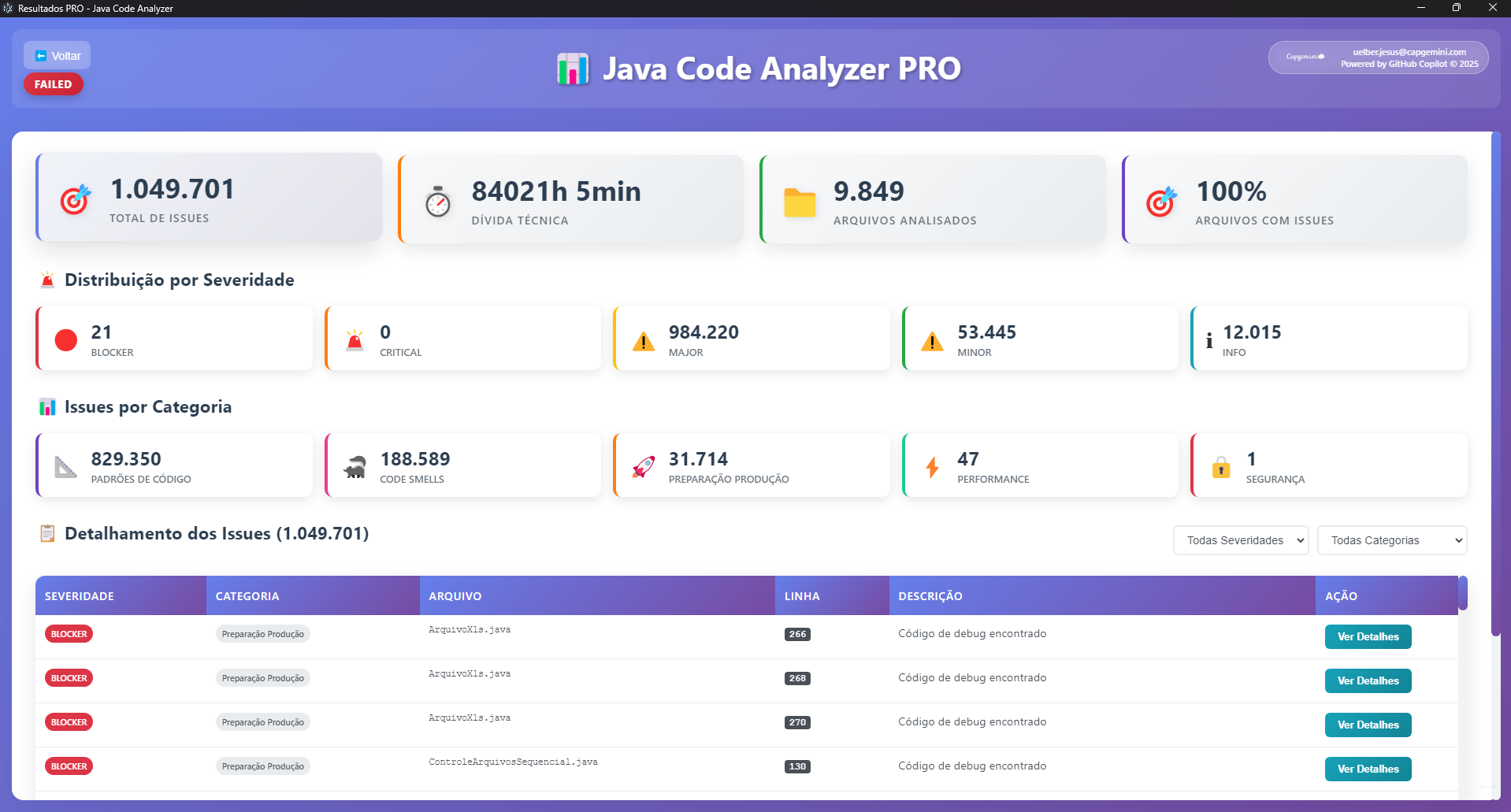 O Java Code Analyzer PRO é uma ferramenta desktop desenvolvida com Electron que realiza análise estática de código Java, identificando problemas de qualidade, padrões de código, vulnerabilidades de segurança e code smells.