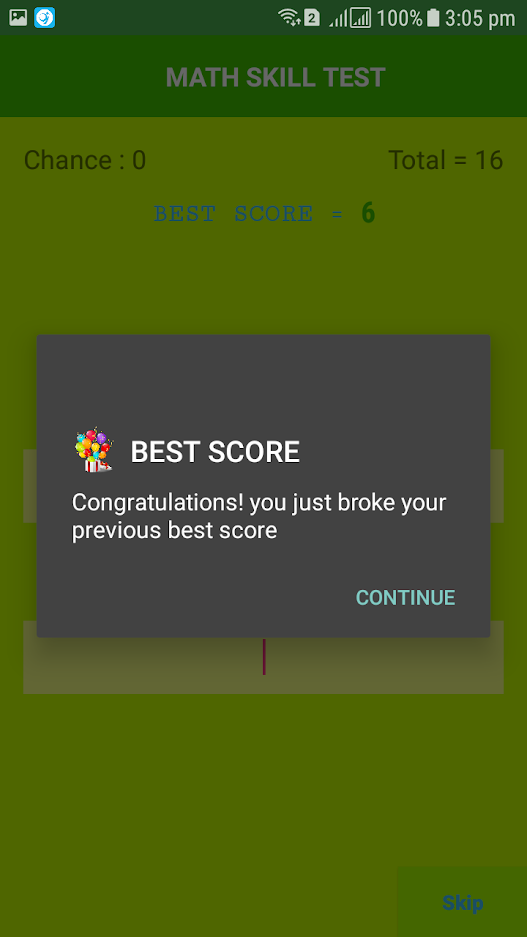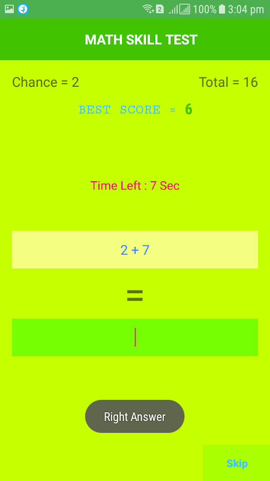 Math-Skill-Tester-Game An Andorid Quiz game, First Developed in 2016. Play store link: https://play.google.com/store/apps/details?id=com.ashraf.mathskilltest #Screenshot License This project is licensed under the MIT License - see the License File for details