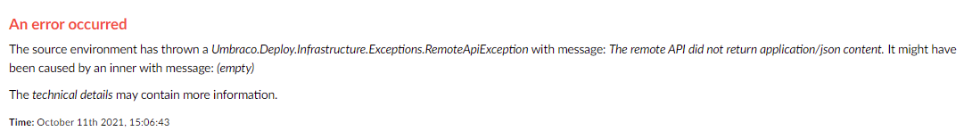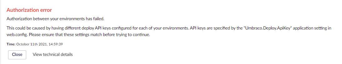 With Deploy V4/CMS V8, if the API keys in a source and destination environment don't match, the failure is clearly reported:  With V9 it's less obvious:  We should surface the same error message in this situation.
