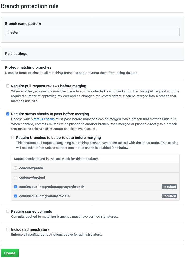 But how can we enable that? I think the trick is to add a branch protection rule in Settings > Branches > Add rule and require the travis and appveyor statuses.