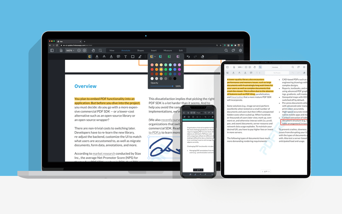 WebViewer is a powerful JavaScript-based PDF Library that's part of the PDFTron PDF SDK. It provides a slick out-of-the-box responsive UI that interacts with the core library to view, annotate and manipulate PDFs that can be embedded into any web project.