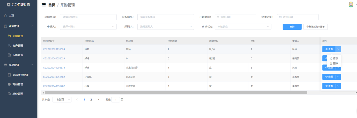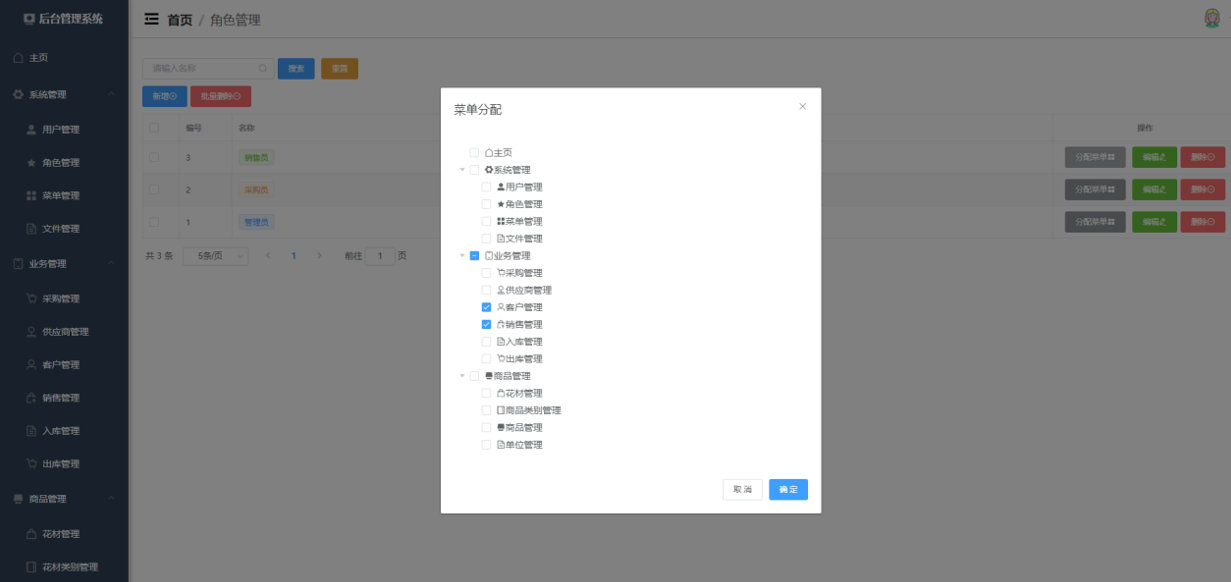 - 花材管理:对花材信息进行新增、修改及删除。