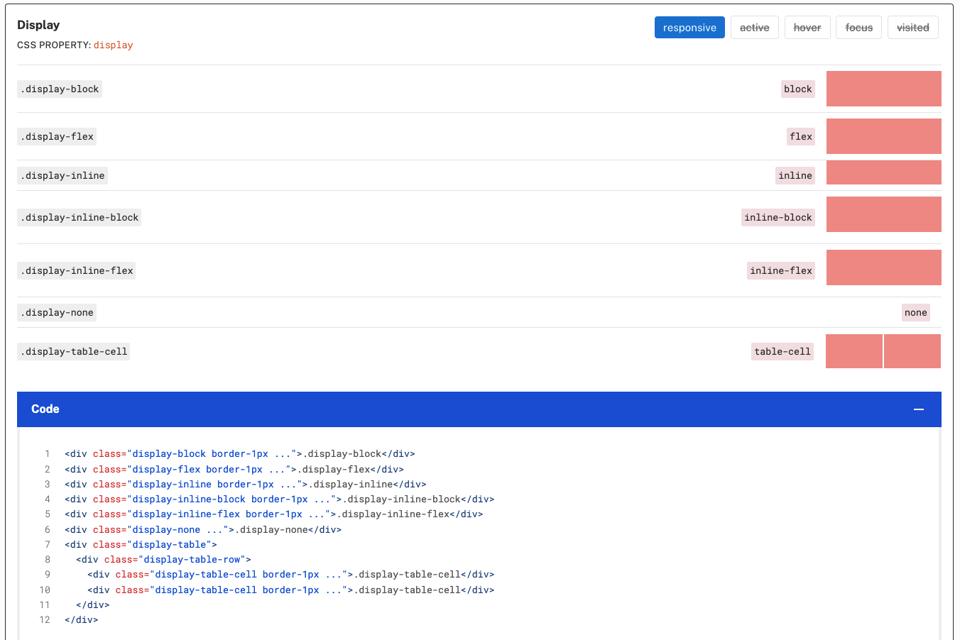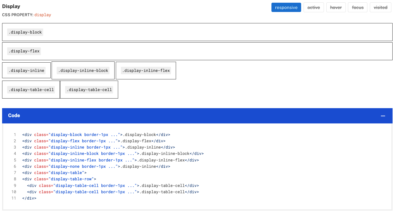 .display-none. Because this class hides the display of the element, users do not know that the utility class exists unless they look at the code snippet.Solution