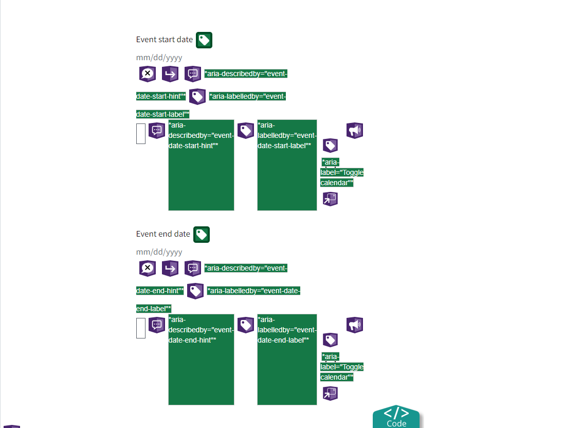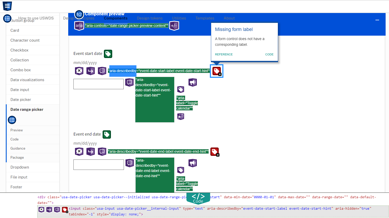 USWDS - Date Picker: Added aria labels to date picker components for 508 compliance. Resolves #4347 #4414