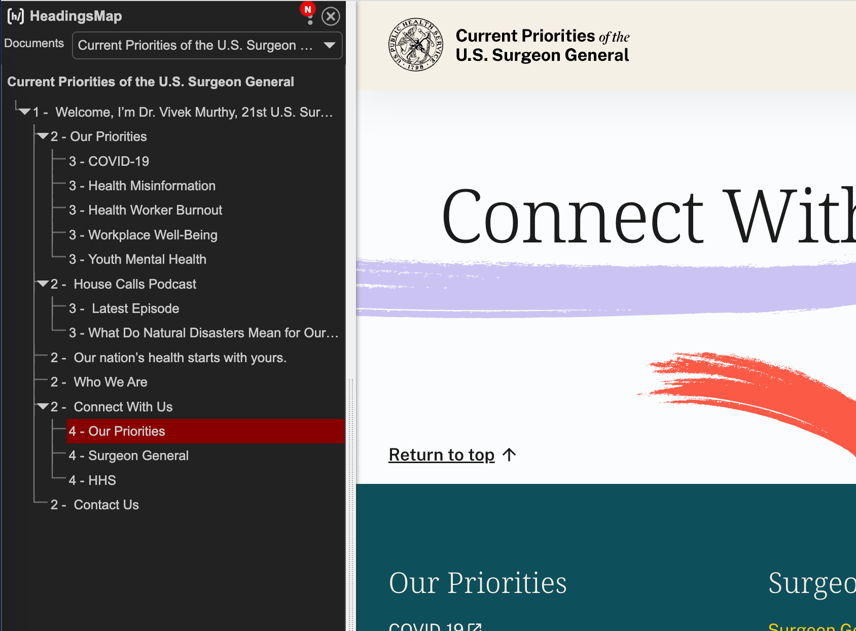 Issue: Headings are not properly nested in the footer on OSG priorities pages. The