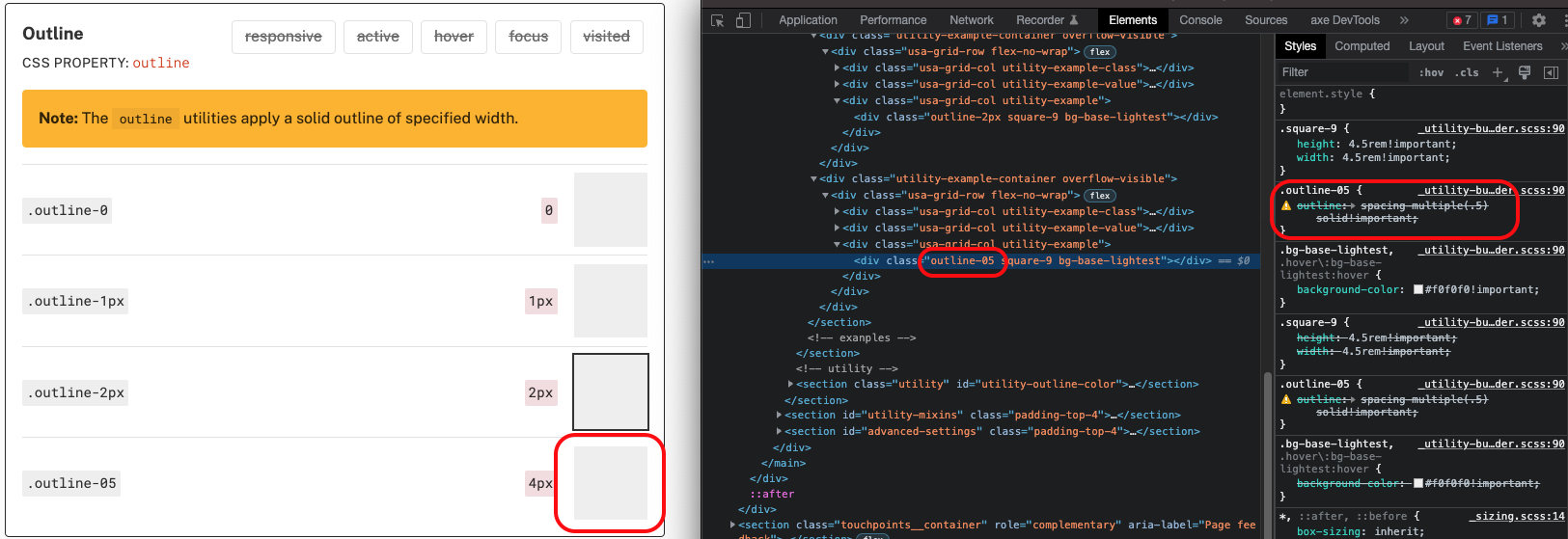 outlineutility so that it can accept the '05' spacing token. Now, the.outline-05utility class andu-outline('05')mixin should work as expected.Breaking change