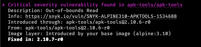 More info: https://security.snyk.io/vuln/SNYK-ALPINE310-APKTOOLS-1534688