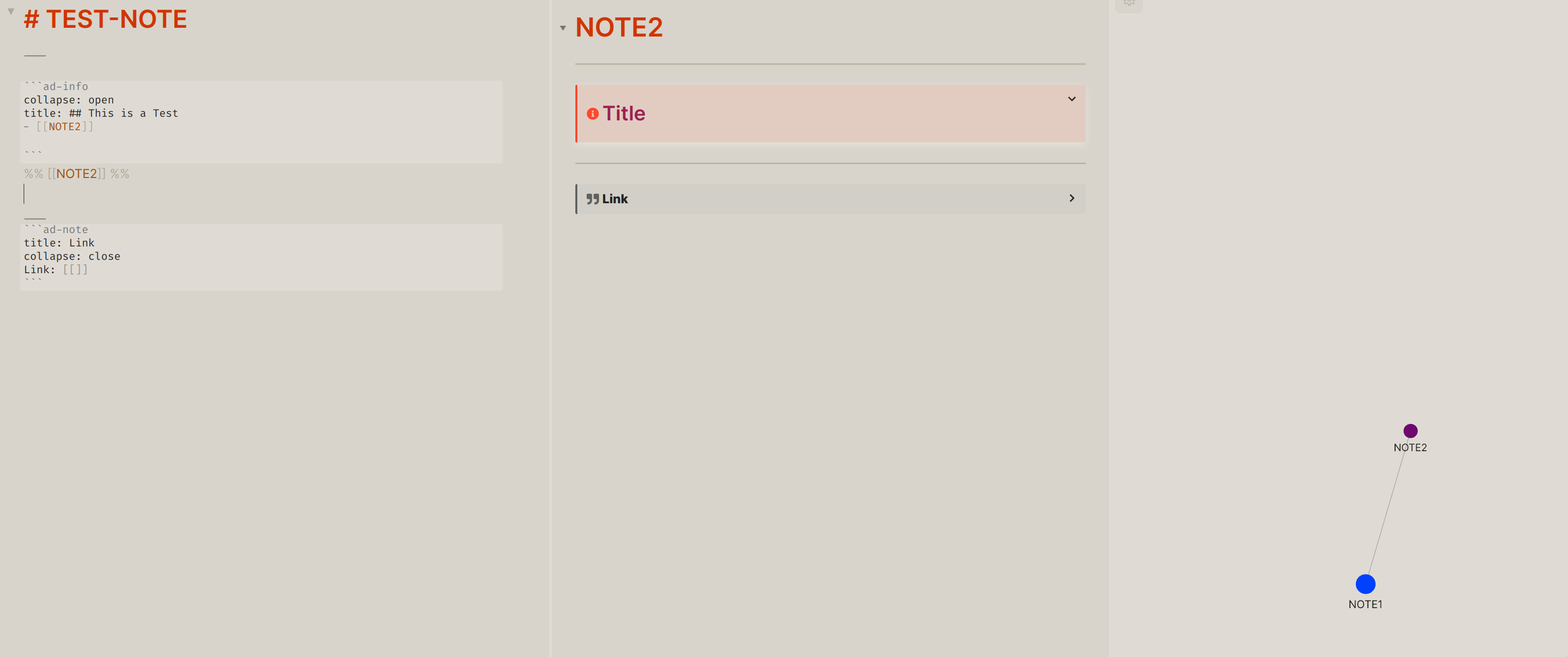 Unfortunately this would be difficult to solve. I don't know how Obsidian's graph view is created, but I would assume it is being built from their metadata cache. Because the Admonition content is rendered as markdown after the note, it is not pushed into the cache. I think if you require the graph view to show this, you'll have to create the links outside of the admonitions (at least for now -- I'll try to think of a way to possibly implement this, or the API could be updated to allow for it easier). |