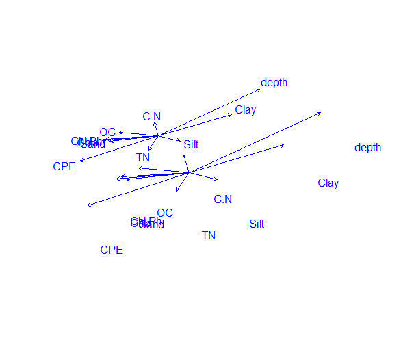 at=c(x,y)argument, the vectors' origin is displaced by x,y, but the labels are displaced by 2x,2Y, as in the following instance:generated with: