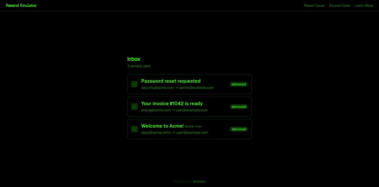 Ran the emulator, sent 3 test emails (welcome, invoice, password reset), verified inbox shows from/to/subject/status, clicked through to detail page with HTML preview. Screenshots above are from the running emulator.