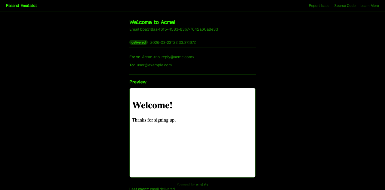 Thanks for this excellent contribution! The Resend emulator follows existing service patterns really well, the inbox UI is a great differentiator, and all 23 tests pass cleanly. A few small things before merging: