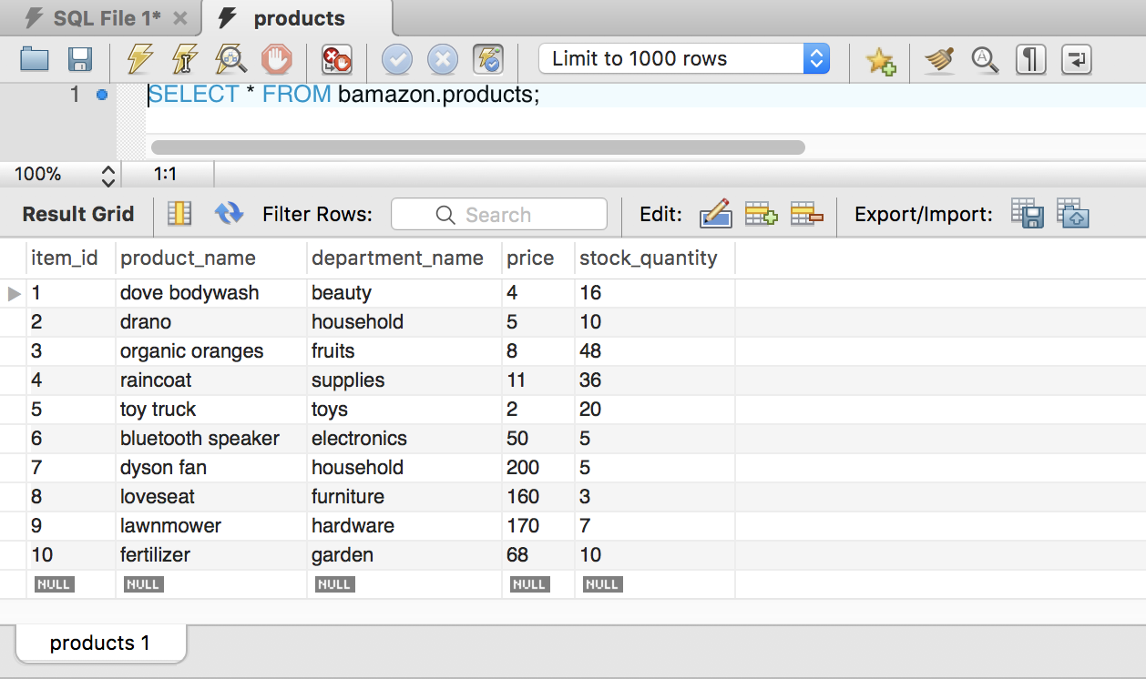 Challenge #1: Customer View Create a MySQL Database called bamazon. Then create a Table inside of that database called products. The products table should have each of the following columns: