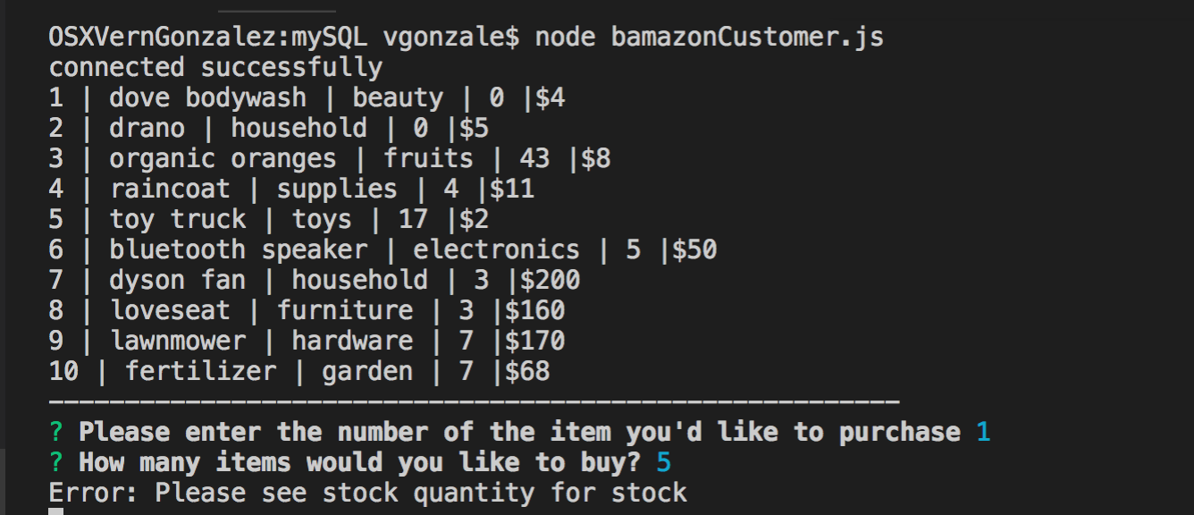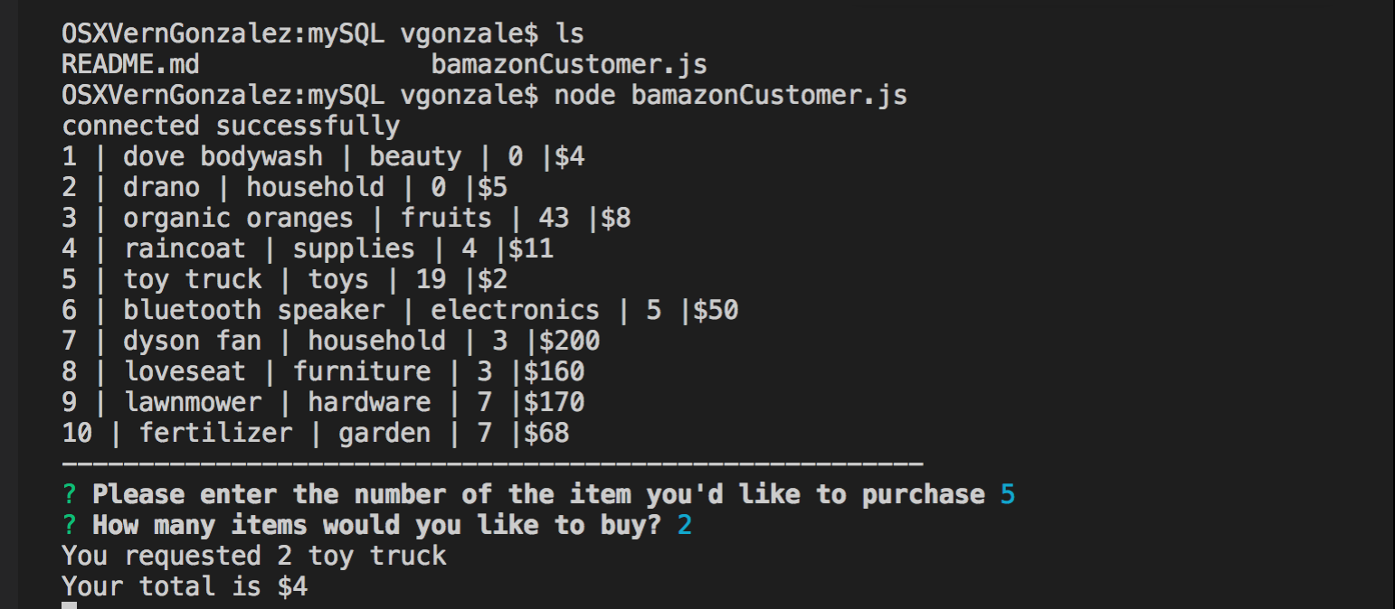 **Screenshot: (shows successful connection to mySQL and the table being read, list of items, questions being asked of the customer. Once the update goes through, show the customer the total cost of their purchase.