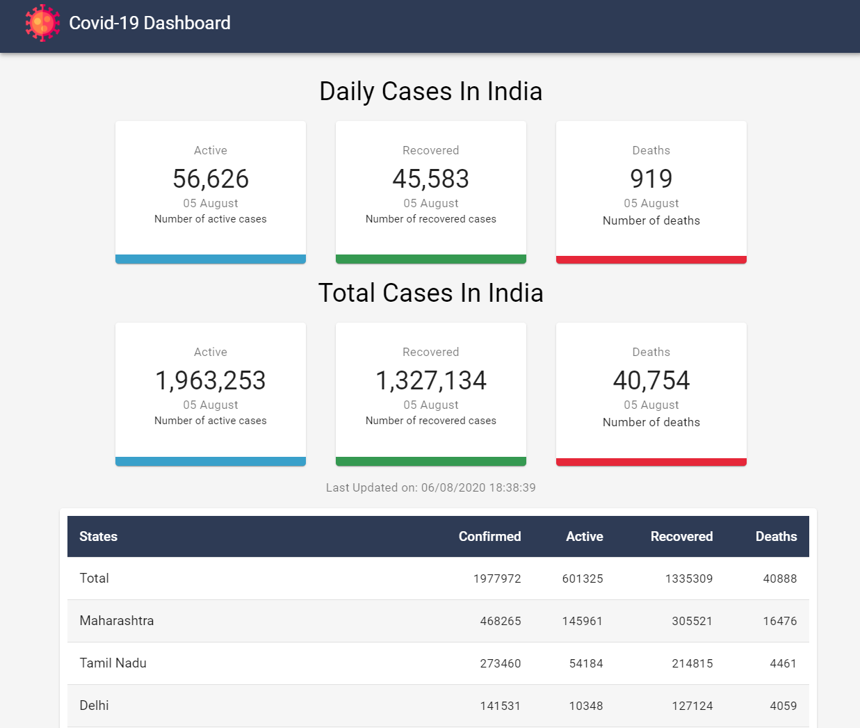 This app shows daily cases, total cases, and a table view of state-wise active cases, deaths, recovered cases along with line chart graphs of each category.