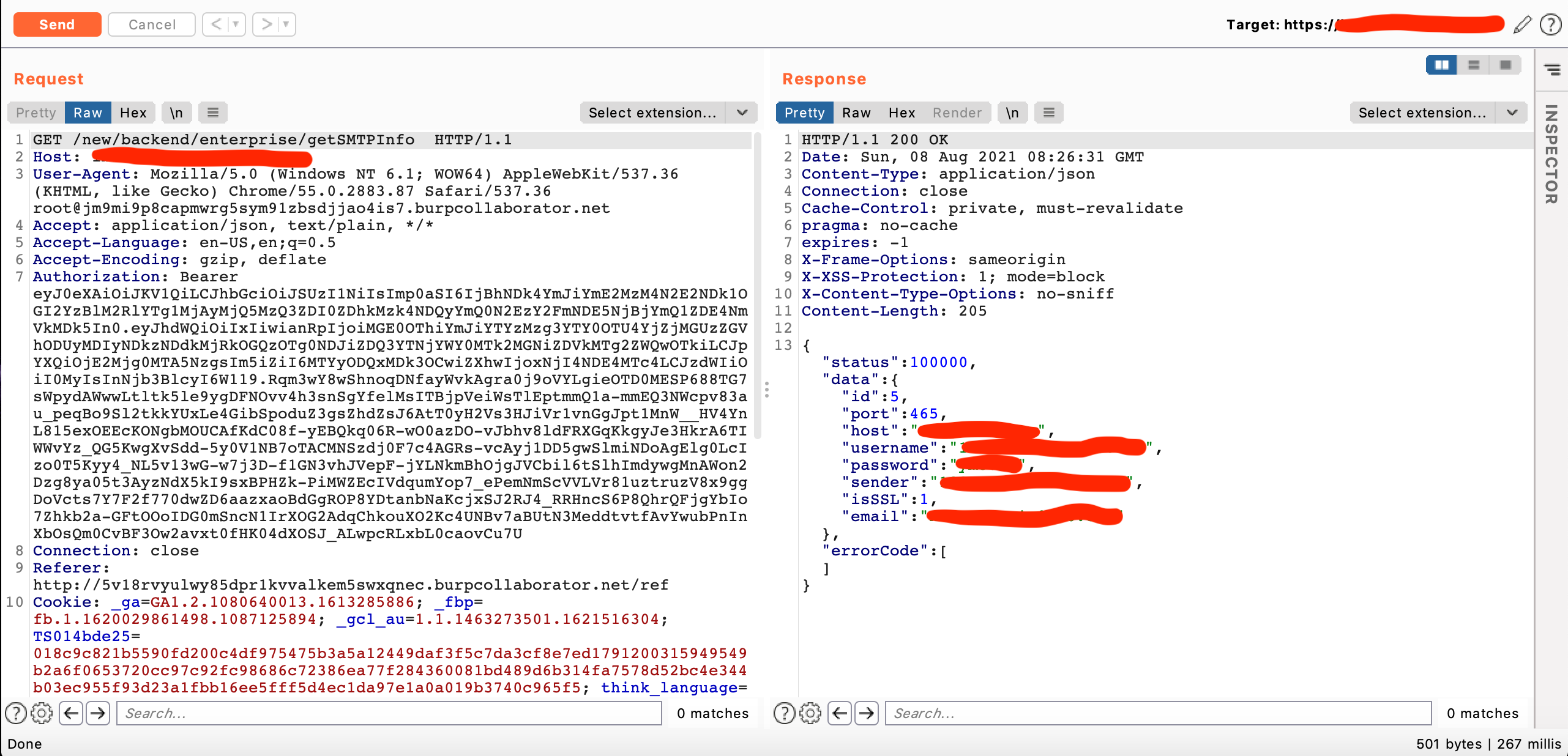 Visit Endpoint given in POC with a restricted role( a role with only User view privileges) User account : (GET /new/backend/enterprise/getSMTPInfo)