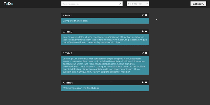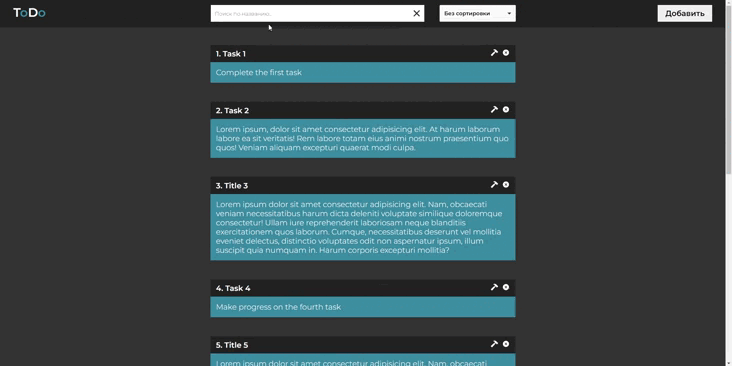 ToDo - это пет-проект разработанный на основе React, и представляет собой простую, но эффективную систему управления задачами. Он предоставляет пользователю удобный интерфейс для создания, просмотра и редактирования списка задач. Также имеется возможность фильтрации и сортировки задач.