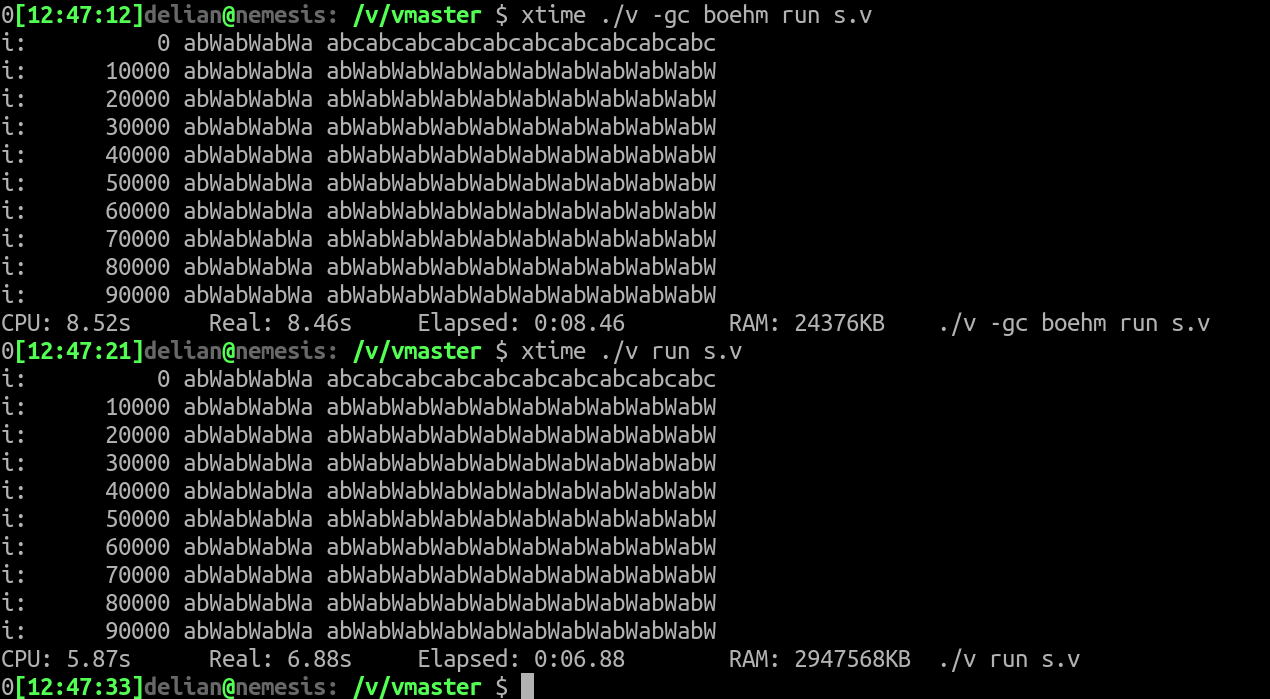 -gc boehmduring compilation, i.e. linking and using the Boehm-Demers-Weiser conservative C/C++ Garbage Collector from https://github.com/ivmai/bdwgc, which is often packaged and available on Linux distributions.The intent is reducing the memory usage of programs, that process large amounts of text in batch mode on low memory environments (small VPSes), and for which a few ms of garbage collection pauses from time to time do not matter much.