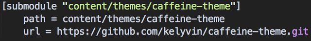 $ git clone https://github.com/kelyvin/caffeine-themeIf you have your Ghost blog hosted on git and you want to continuously get the latest updates, you can add this repo as a submodule. Create a .gitmodules file in your root Ghost installation and add the following like so: