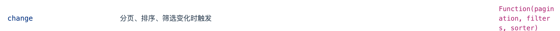 table 组件的 change 事件的回调函数参数不全。遗漏了最后一个也是最核心的包含变更后 dataSource 的参数对象,具体调用时可以打印出来,希望文档能补充完整,让使用者少走一些弯路。