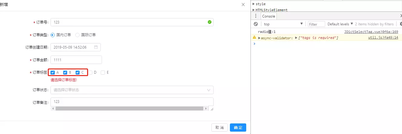 使用封装了 并添加的公共组件向后台传参时,获取不到v-decorator="['tags', {rules: [{ required: true, message: '请选择标签!' }]}]"声明的属性值"tags",required验证无法通过