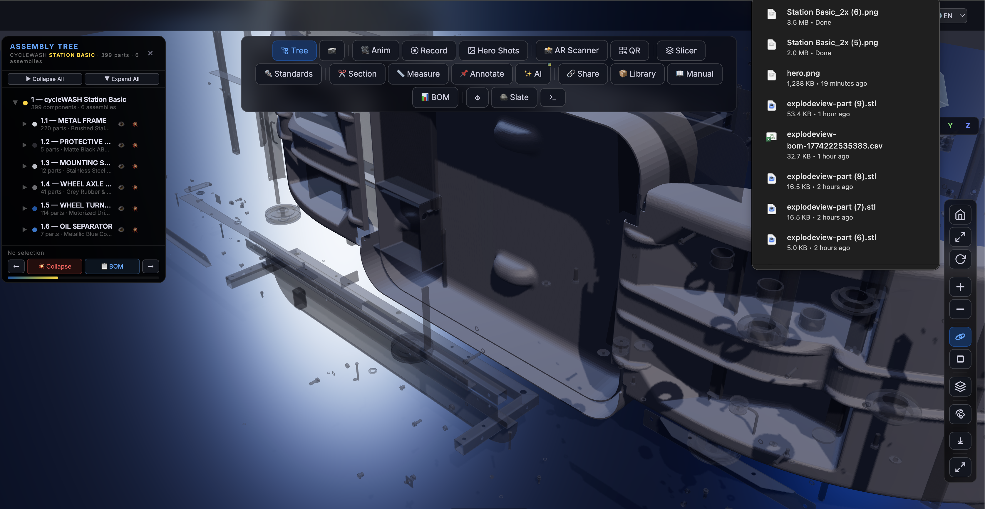 - Sub-assembly highlighting — click any assembly to isolate and inspect it