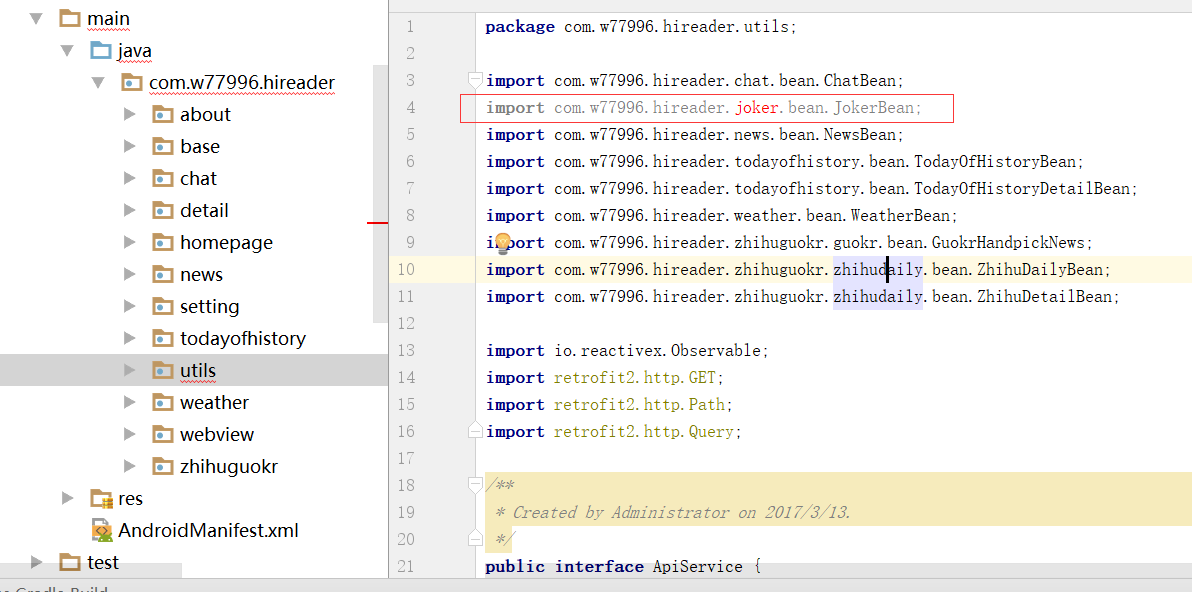 嗨, 你好 ! 我运行你的HiReader项目工程时, 编译项目的时候碰到 ApiService 文件中引入 import com.w77996.hireader.joker.bean.JokerBean 这个文件找不到, 且我查找了本地工程和你的Github仓库 都没有找到joker这个文件夹。 你能帮忙看一下这是什么情况吗? 或者如果真的没有这个文件夹的话,烦请更新一下Git仓库, 以便为更多的开发者带来方便。 再此为开源点赞 感谢你的开源! 谢谢