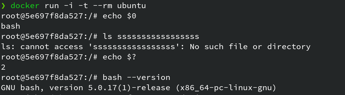 `ls` 文件不存在返回值为 2,测试代码: ```bash ❯ docker run -i -t --rm ubuntu root@5e697f8da527:/# echo $0 bash root@5e697f8da527:/# ls sssssssssssssssss ls: cannot access 'sssssssssssssssss': No such file or directory root@5e697f8da527:/# echo $? 2 root@5e697f8da527:/# bash --version GNU bash, version 5.0.17(1)-release (x86_64-pc-linux-gnu) ```
