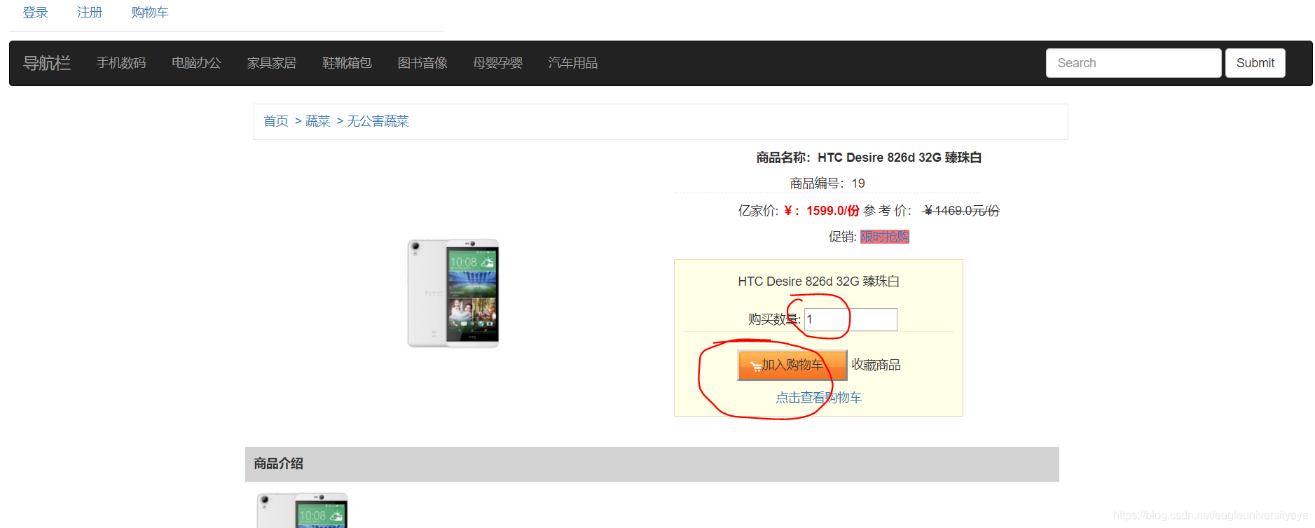 1.将商品加入购物车:任一点击一个商品,进入商品详情页面,可以将商品加入购物车,并设置加入购物车的商品数,点击加入购物车后立即跳转到购物车管理页面