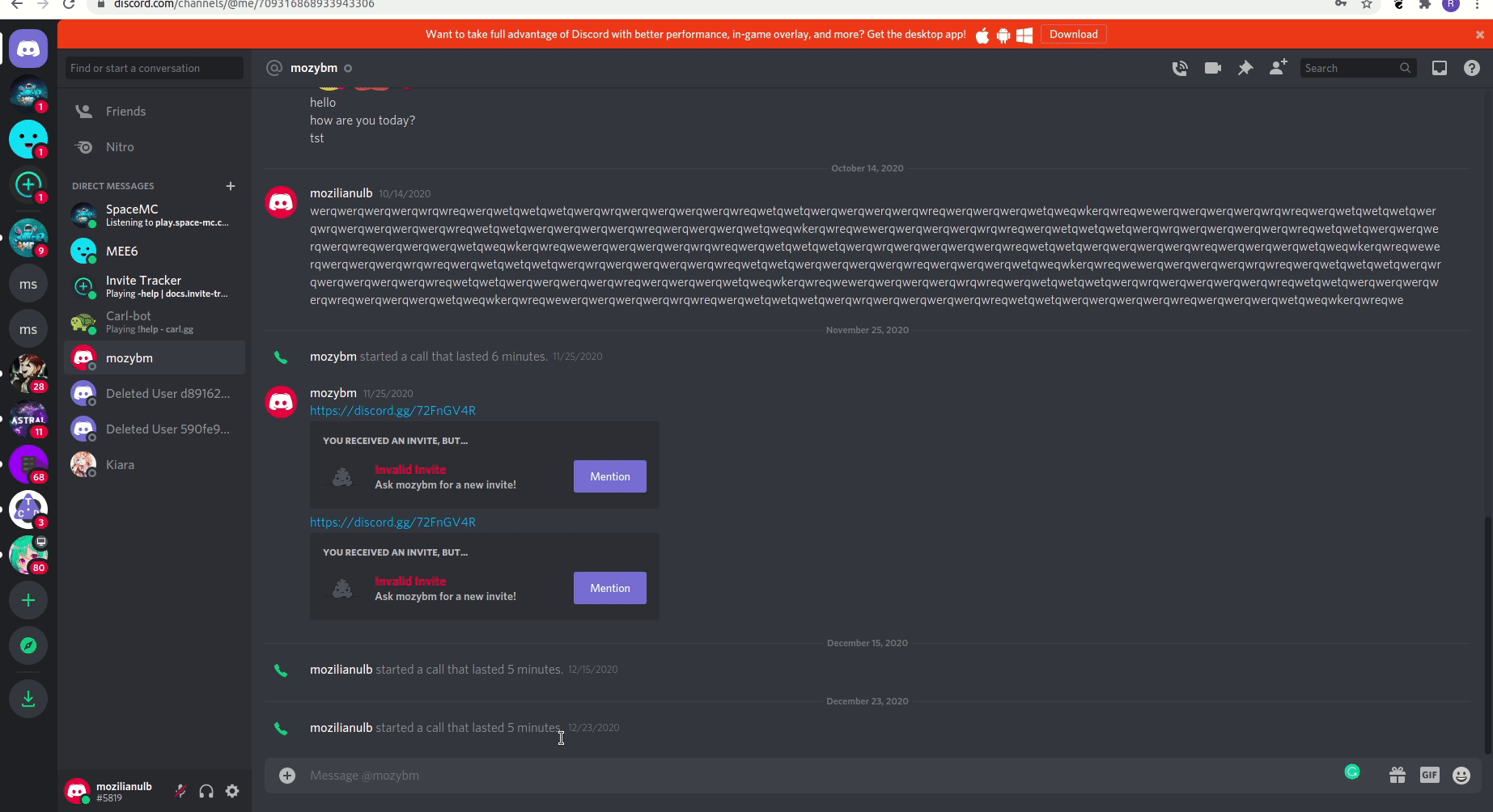 blurevent is sent to Discord and the text input loses focus. In this case Discord would listen tokeydownand put whatever key it received into the input box. However, this behavior is incompatible with Japanese IME, since the IME is disabled when there's no focus on text input. (This part of the bad behavior also happens with Chrome.) The issue with Firefox is that it would trigger this broken behavior every time I switch IME because it sends ablurevent, while Chrome presumably does not do so.Browser Configuration