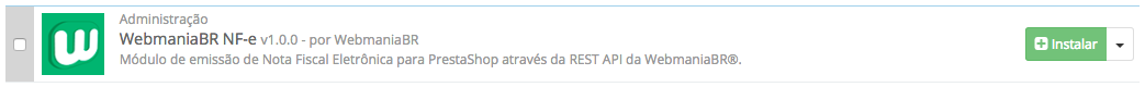 - Acesse o menu Extensões > Módulos. Localize o módulo chamado WebmaniaBR NF-e e clique no botão Instalar.