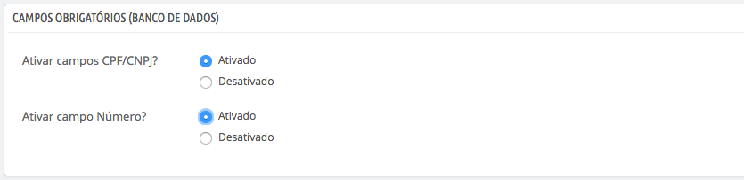 Para emitir uma NFe, é obrigatório informar o Tipo de Pessoa (CPF/CNPJ), número e bairro do Endereço. O módulo possui a opção para habilitar estes campos: