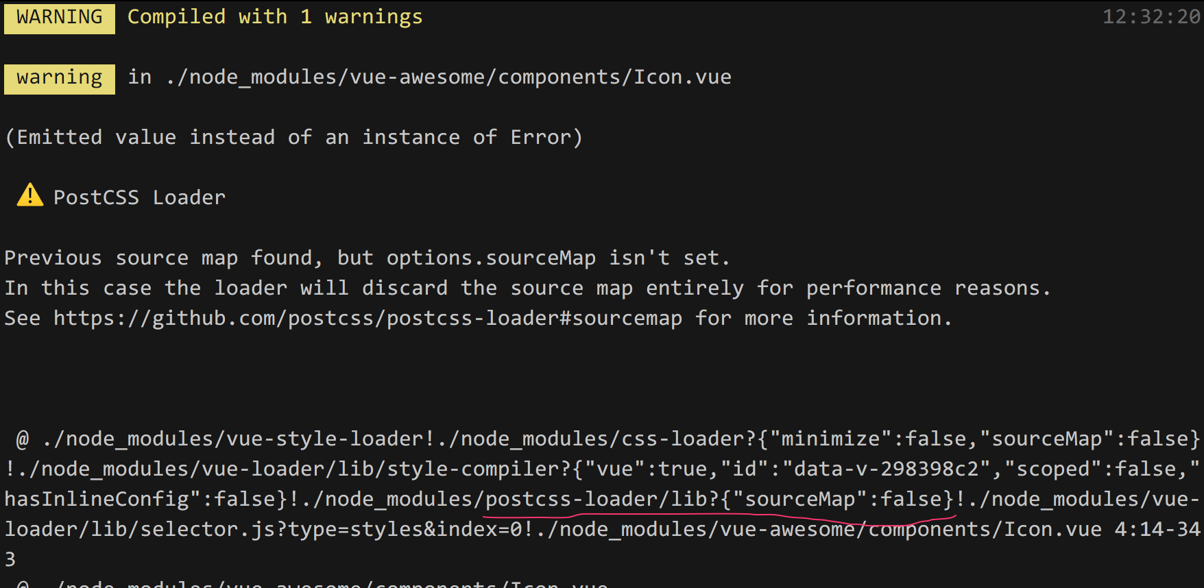 { loader: 'postcss-loader', options: { sourceMap: false } }, // warning