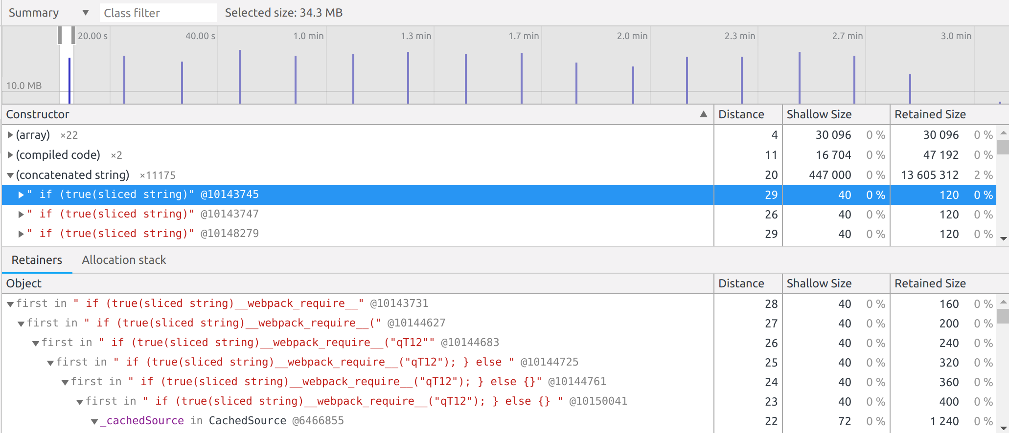 forEachLimit(15) changeI noticed the same amount of memory being allocated, except now it was adding 34MB of memory usage every frame. Note that each time it is storing