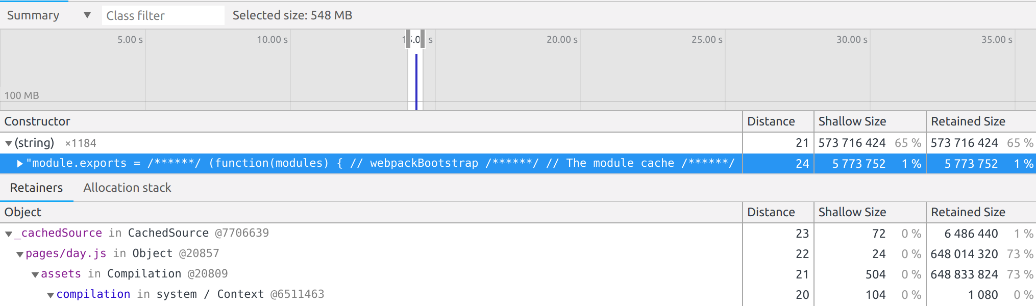 The timelines are only from the "additional chunk assets processing (91%)" stage plus or minus some time. As a note, the profiling slows down the process considerably and I started the profiling manually close to the crash, so don't pay much attention to the lengths of time shown in the timelines.