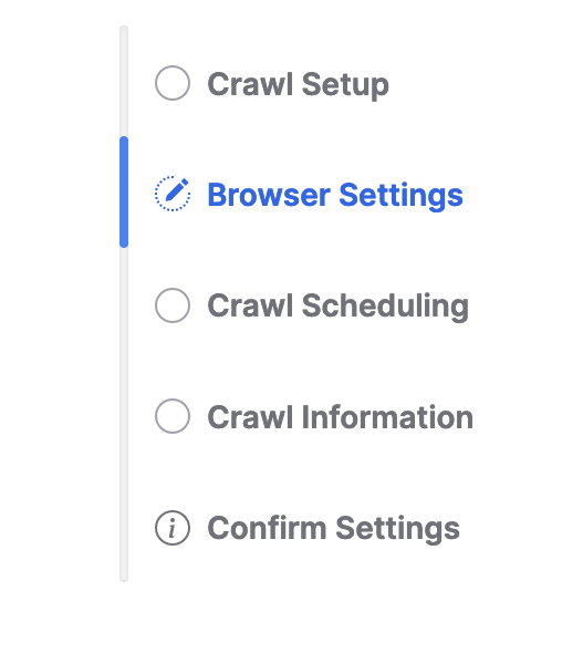 Now that the steps aren't disabled, can we set iconProps circle "text-neutral-400" instead of 300 to communicate that the step is enabled? The progress indicator bar now operates as only a step indicator. This may have been a miscommunication on my part. I still think it should start from the topmost step and extend downward as it did previously so that it communicates a completion % as users progress toward the end of the process. This will be in line with how we will use it on browser profile setup — though parts of that form will be enforced.  |