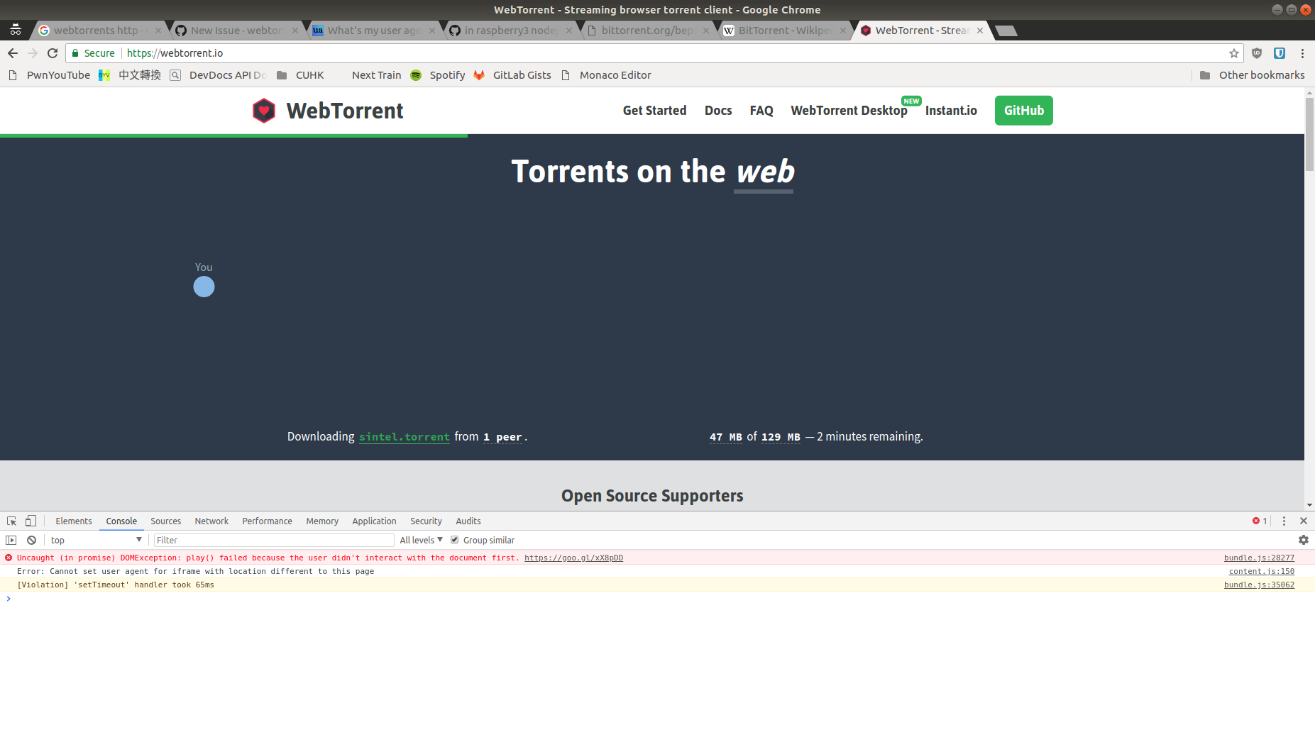Thanks for reporting this issue. I opened an issue on the website repo here: webtorrent/webtorrent.io#128 Working on fixing this right now. Let's continue discussion in that issue. |