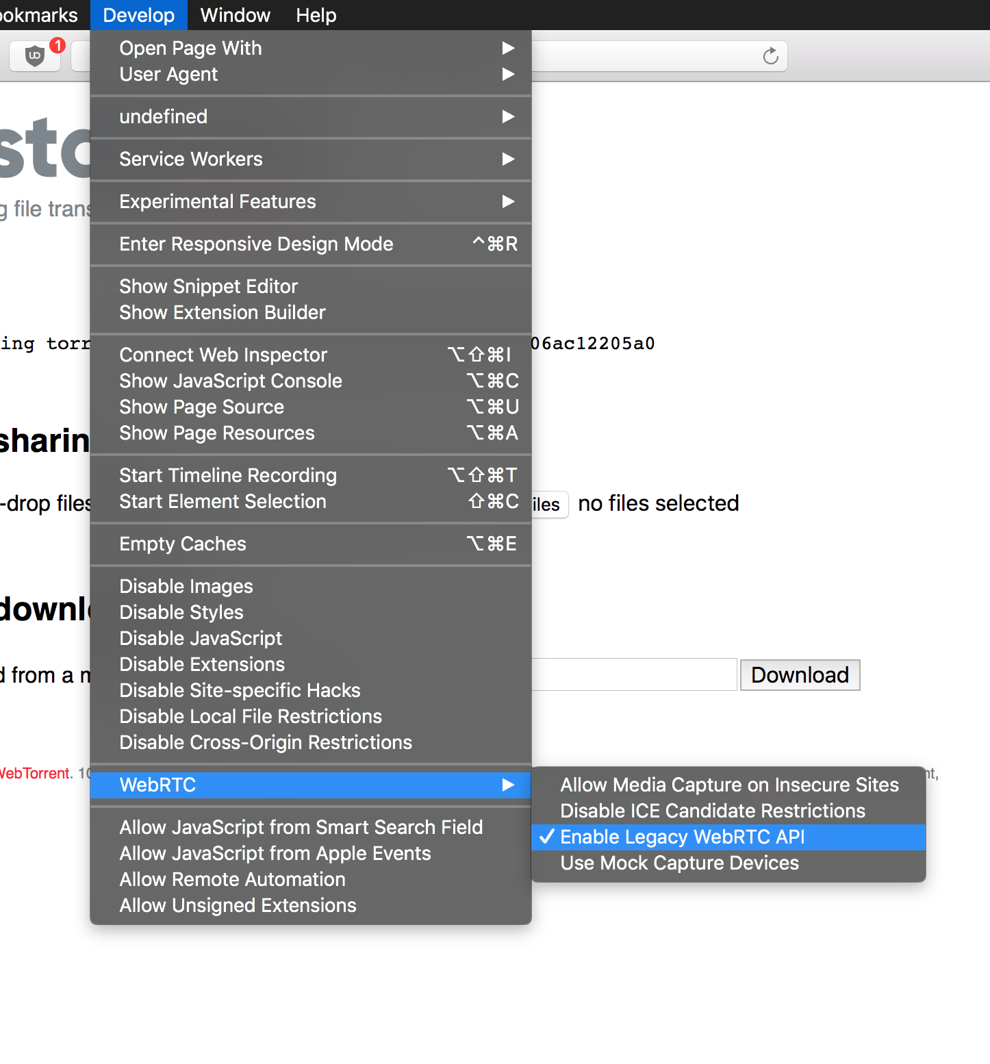 Expected a WebTorrent client in Safari on MacOS and Safari Mobile/Chrome Mobile on iOS to correctly download and upload files since they now have WebRTC support. WebTorrent docs does list Safari as a compatible web browser now.