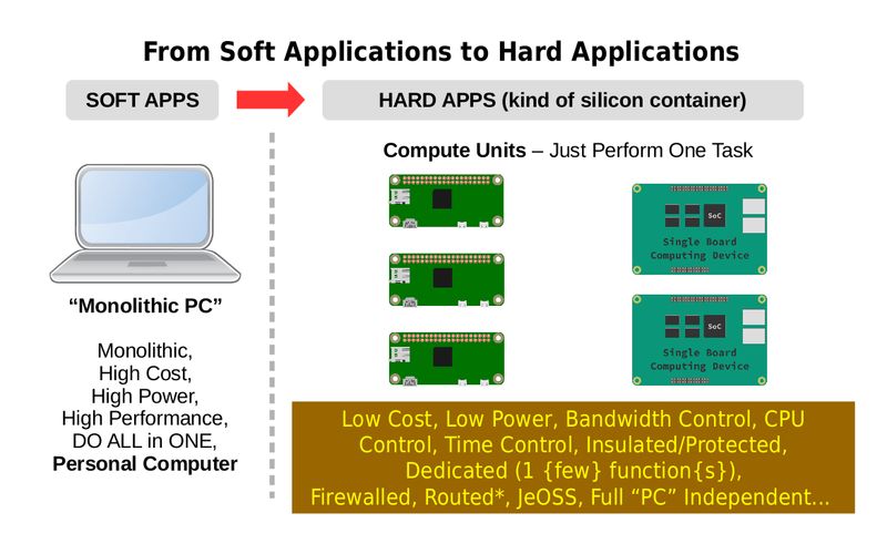 I think that we need to "detach" soft apps from the monolithic general purpose desktop PC, and have them running into "domain specific" HARD APPS... again, there is little need to invent something new, it is just a question of changing the Paradigm that is prevalent (the desktop PC)...