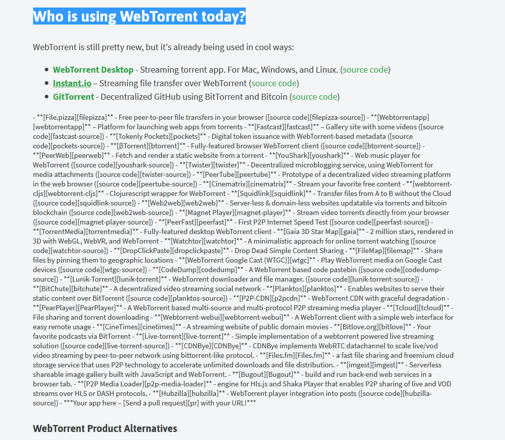 The list of URLS in the "Who is using WebTorrent today?" is showing its markdown without parsing it after the link to GitTorrent
