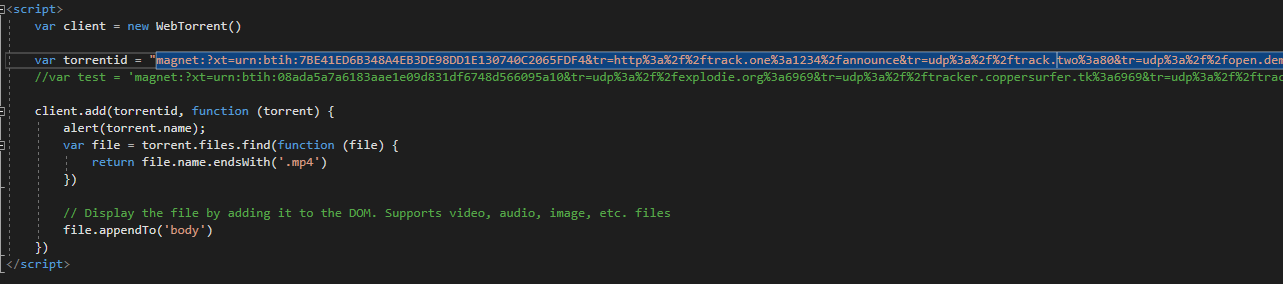 var torrentid = "magnet:?xt=urn:btih:7BE41ED6B348A4EB3DE98DD1E130740C2065FDF4&tr=http%3a%2f%2ftrack.one%3a1234%2fannounce&tr=udp%3a%2f%2ftrack.two%3a80&tr=udp%3a%2f%2fopen.demonii.com%3a1337%2fannounce&tr=udp%3a%2f%2ftracker.openbittorrent.com%3a80&tr=udp%3a%2f%2ftracker.coppersurfer.tk%3a6969&tr=udp%3a%2f%2fglotorrents.pw%3a6969%2fannounce&tr=udp%3a%2f%2ftracker.opentrackr.org%3a1337%2fannounce&tr=udp%3a%2f%2ftorrent.gresille.org%3a80%2fannounce&tr=udp%3a%2f%2fp4p.arenabg.com%3a1337&tr=udp%3a%2f%2ftracker.leechers-paradise.org%3a6969S"