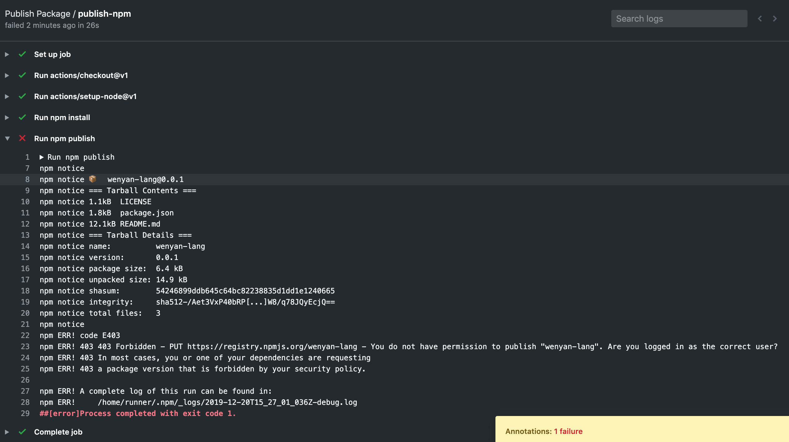 @LingDong- Oh I am sorry. Seems the name is occupied by someone else just now. https://www.npmjs.com/package/wenyan-lang I am not too sure how to deal with this circumstance. Maybe we can contact him/her to transfer the ownership or we just change the name and try again. |