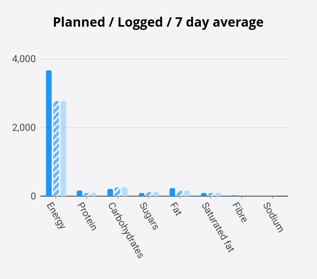 The graphs for logged / avg / 7 day average should chart energy (measured in kcal) and macronutrients (measured in g), since both use the same axis the energy would dominate the grap. At the moment the energy is commented out, but we would ideally use a secondary graph for the energy so that their values can still be compared