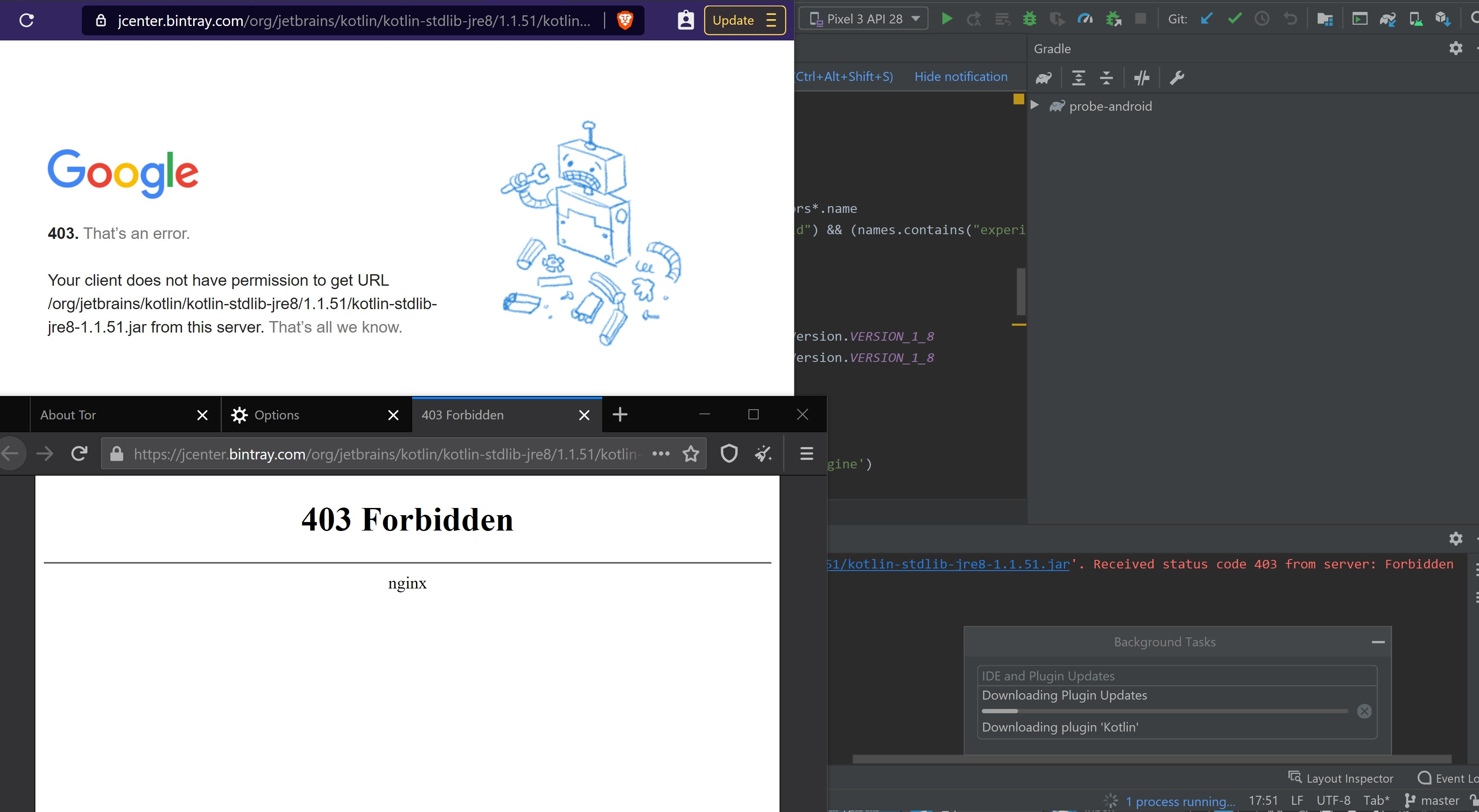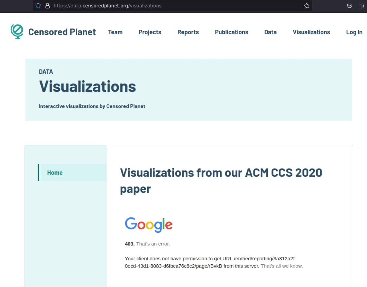 The most common type of blocking users' access due to their IP geolocation is HTTP 403 error. But this error may be caused by the server for any reason, but it is also irrelevant to the embargo. In Google services, differences may be detected through Tor. In the following case, the upper case received a HTTP 403 error as a result of a boycott by Google, and the lower case same error due to an internal server issue: