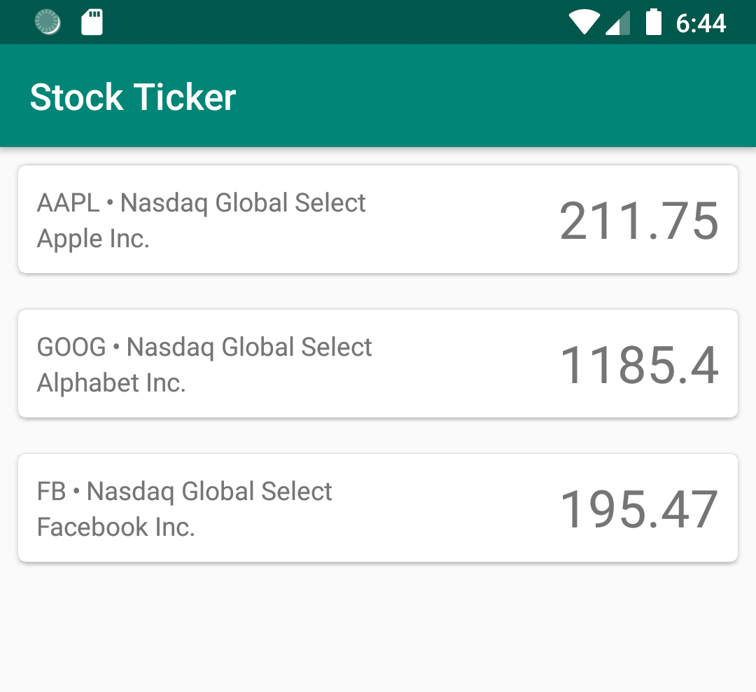 Toy Stock Ticker A toy app demonstrating a stock ticker utilizing Android Architecture components (ViewModels). Utilizes Kotlin, RxJava, Dagger, Retrofit, and GSON.