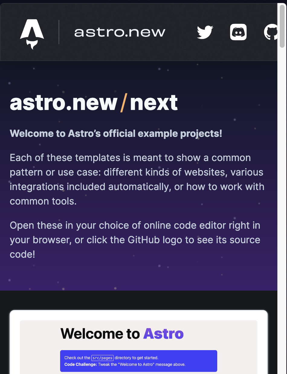 Mobile/tablet doesn't really make much sense here since the site links to web containers, but may be worth a quick mobile layout for the header just so it doesn't overflow - maybe just hide either the astro.new text or the social links?