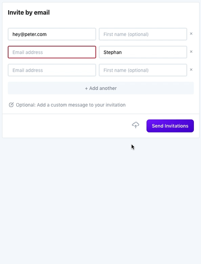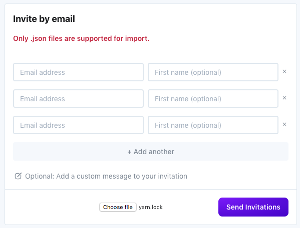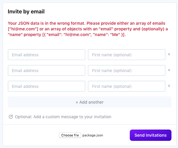 We don't have an existing pattern for this. Maybe it could look like this instead: I don't think we need to describe the optional method of uploading an array of objects; if people find that error message, they can do it, but ideally they just upload the array of emails. What do you think? |